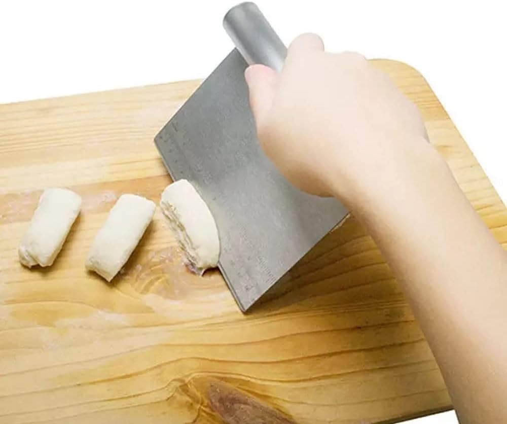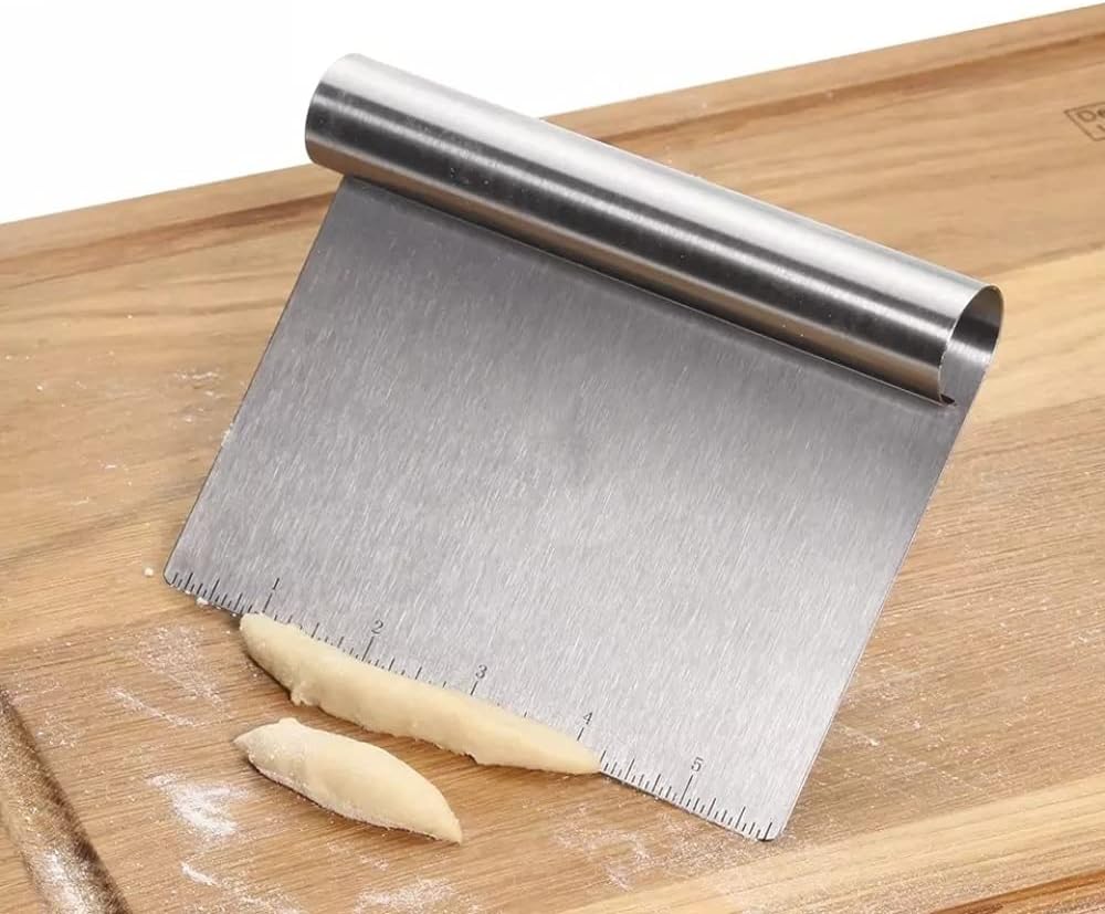 À primeira vista, parece apenas uma lâmina de metal com um cabo, mas esta espátula, também conhecida como “raspador de bancada”, é uma ferramenta multifuncional. Ela é projetada para cortar e dividir massas com precisão, raspar e limpar a farinha grudada na bancada em segundos, alisar coberturas de bolo com acabamento profissional e até mesmo transferir legumes picados da tábua para a panela sem bagunça.